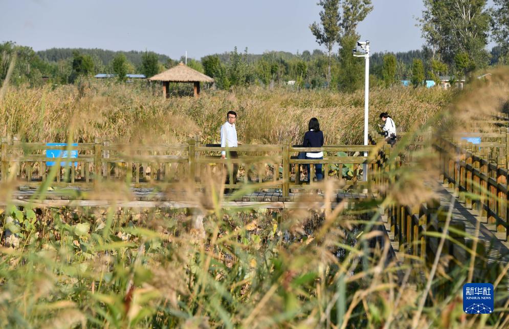 10月10日,游客在山東聊城位山黃河公園裏游覽。