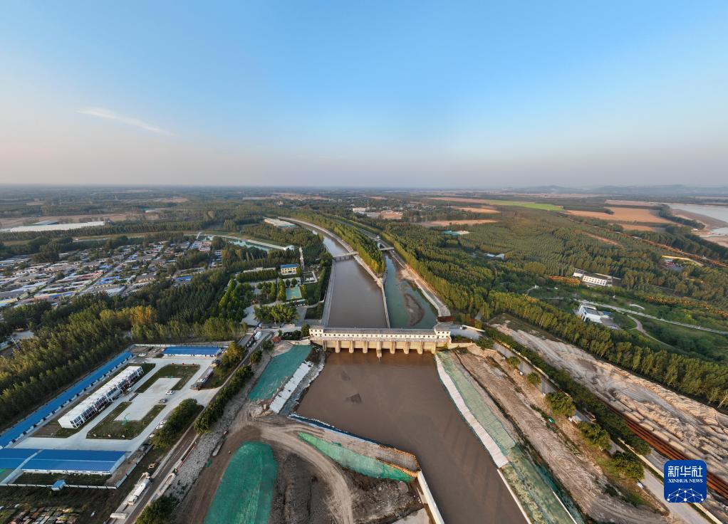 山東聊城位山灌區的黃河位山閘和引水渠(10月10日攝,無人機照片)。