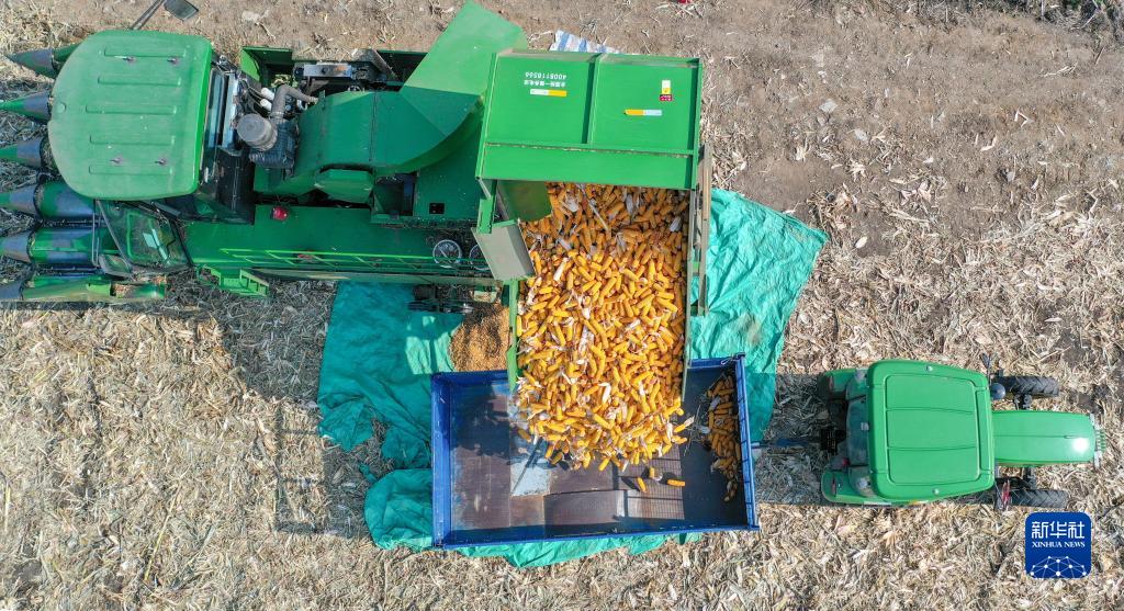 10月11日,在吉林省公主嶺市范家屯鎮乾程農民專業合作社,農民操作農機收穫玉米(無人機照片)。
