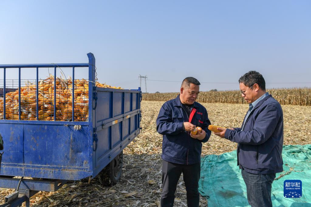10月11日,在吉林省公主嶺市范家屯鎮孟家村,正高級農藝師邱英楠(右)向乾程農民專業合作社理事長王成了解秋收情況。