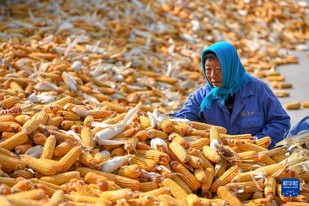10月11日,在吉林省公主嶺市范家屯鎮乾程農民專業合作社,農民整理收穫的玉米。