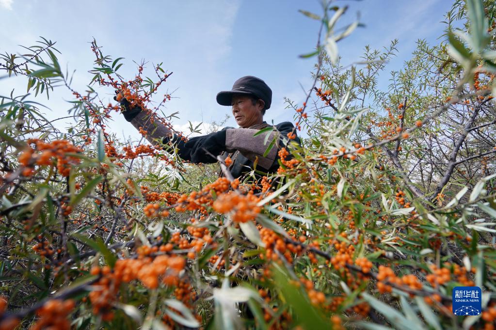 10月11日,沽源縣小廠鎮農民在採摘沙棘果。