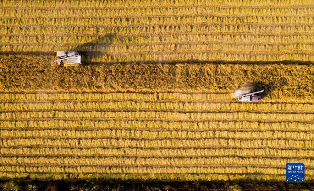 在寧夏銀川市賀蘭縣立崗鎮永華村,農民操作機械收割水稻(10月10日攝,無人機照片)。