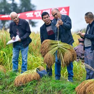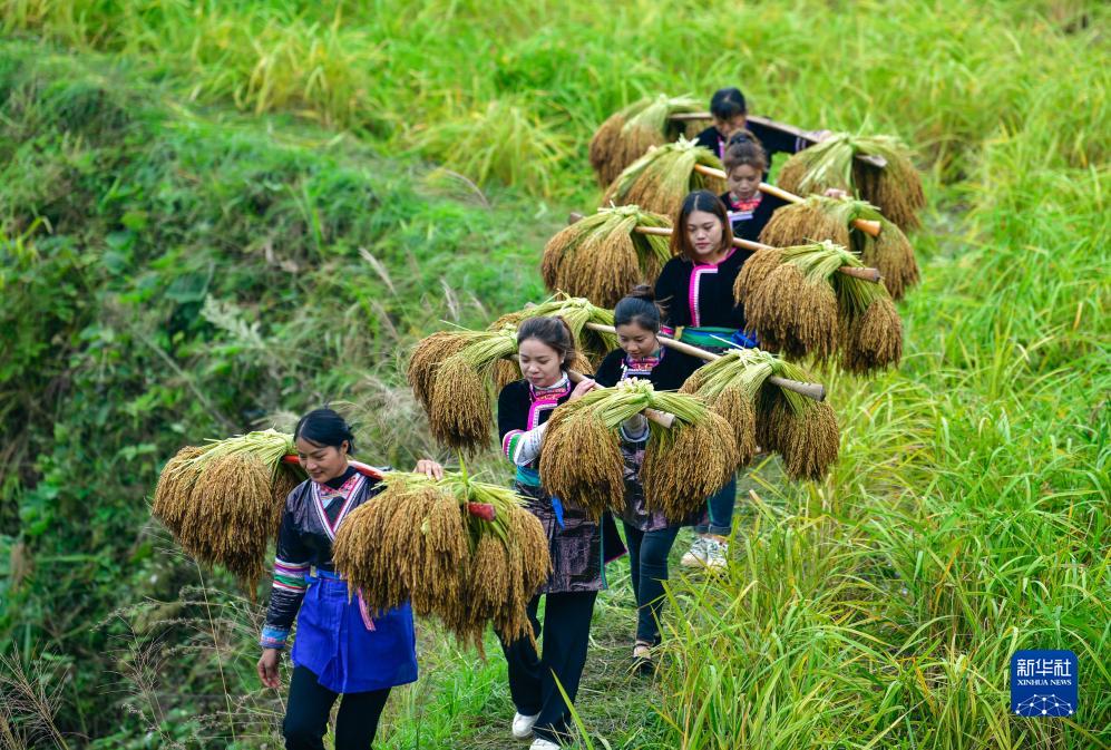 當日,貴州省黔東南苗族侗族自治州從江縣舉辦2023年香禾糯現場測産驗收活動,當地侗族村民忙着采收、搬運測産試驗田裏的香禾糯稻穀。