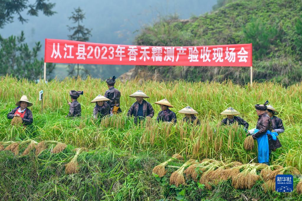當日,貴州省黔東南苗族侗族自治州從江縣舉辦2023年香禾糯現場測産驗收活動,當地侗族村民忙着采收、搬運測産試驗田裏的香禾糯稻穀。