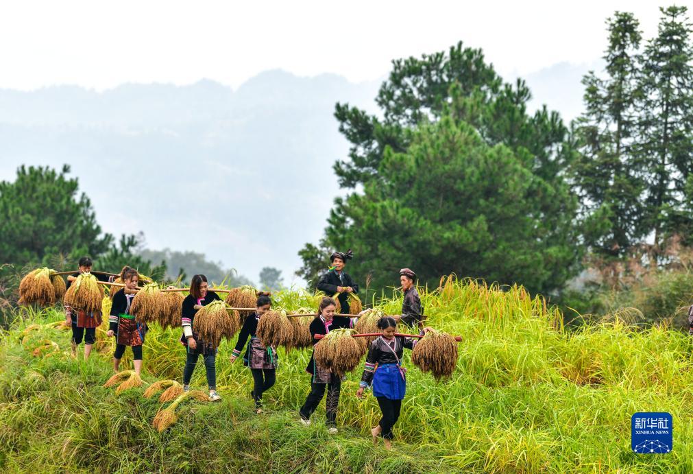 10月11日,村民在貴州省從江縣高增鄉建華村挑運香禾糯稻穀。