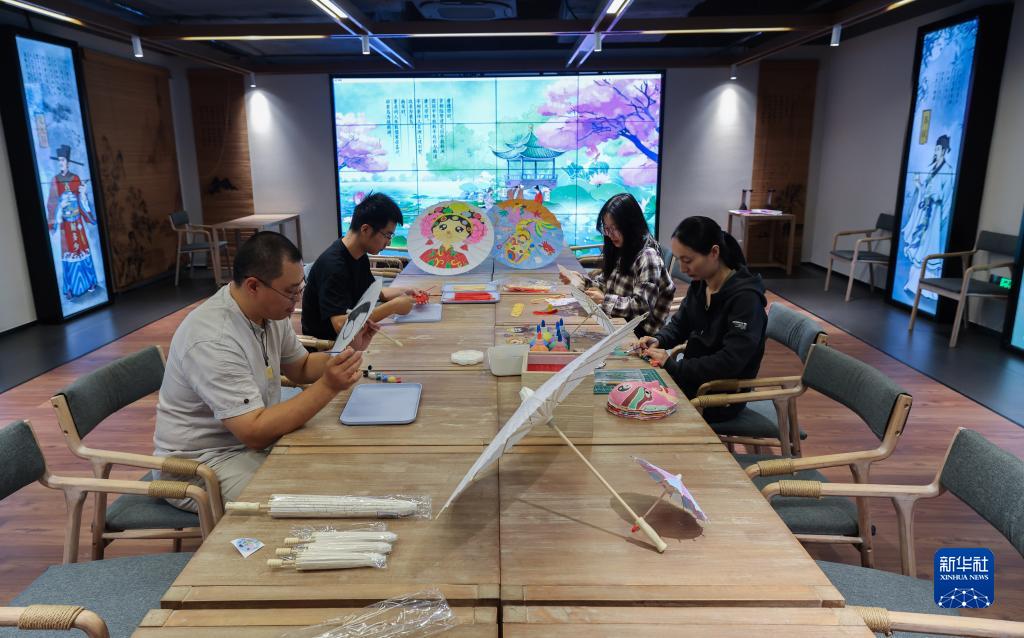 10月11日,游客在大運河數字詩路e站的互動功能區內體驗傳統紙扇繪製。
