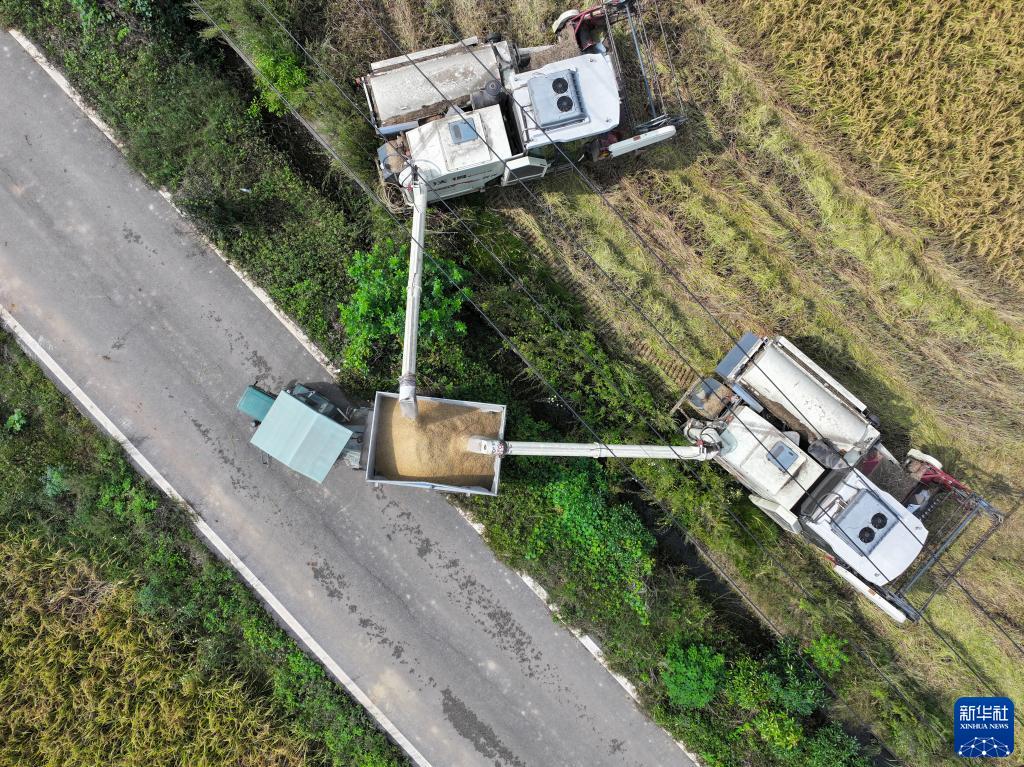 10月11日,在湖南省長沙市望城區烏山街道維梓村,農戶將稻穀裝車(無人機照片)。