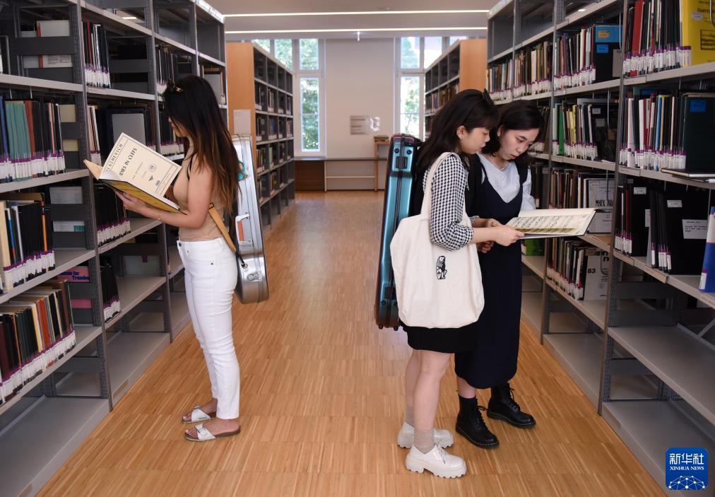 9月13日,中國留學生黃韻瑜(右)、黃韻文(中)、王嘉曦在維也納國立音樂與表演藝術大學圖書館閱覽。