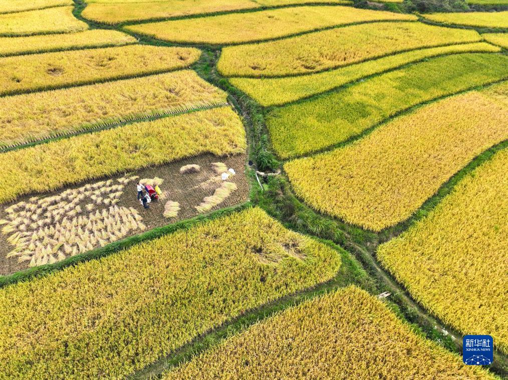 10月11日,湖南省郴州市桂陽縣歐陽海鎮坦溪村村民在收穫晚稻(無人機照片)。