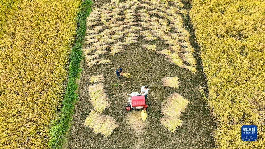 10月11日,湖南省郴州市桂陽縣歐陽海鎮坦溪村農民在搶收晚稻(無人機照片)。
