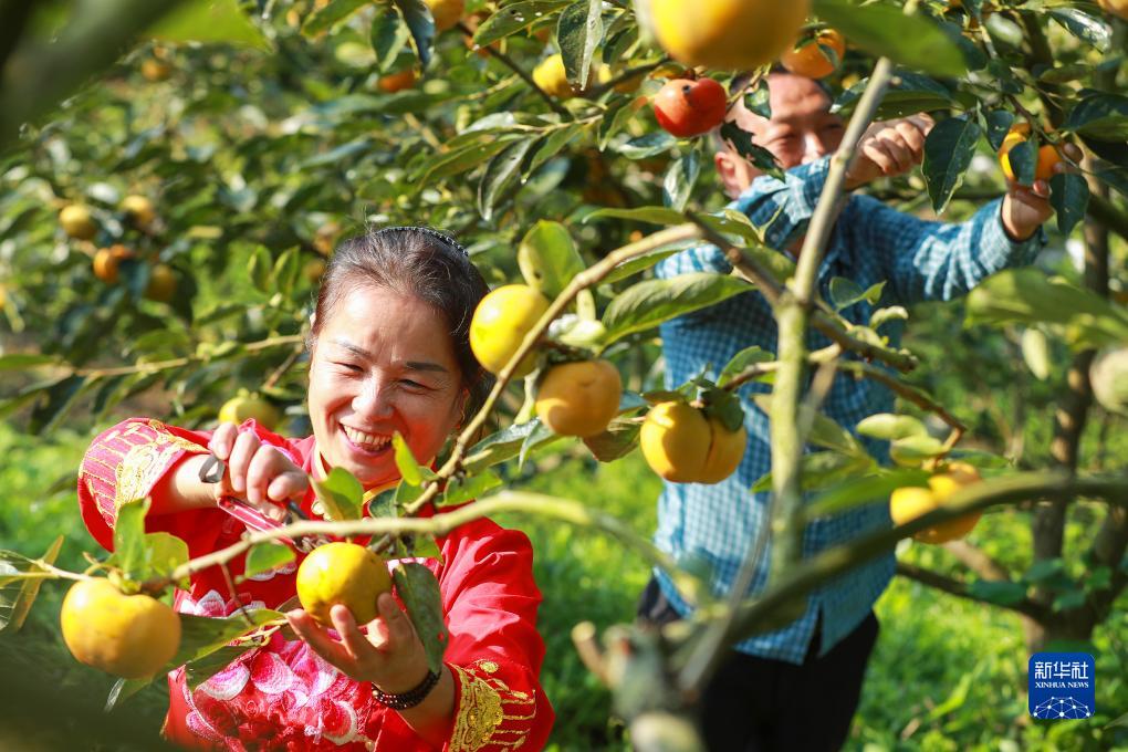 10月11日,湖北省宜昌市秭歸縣九畹溪鎮九畹堂村村民在採摘蘋果柿。
