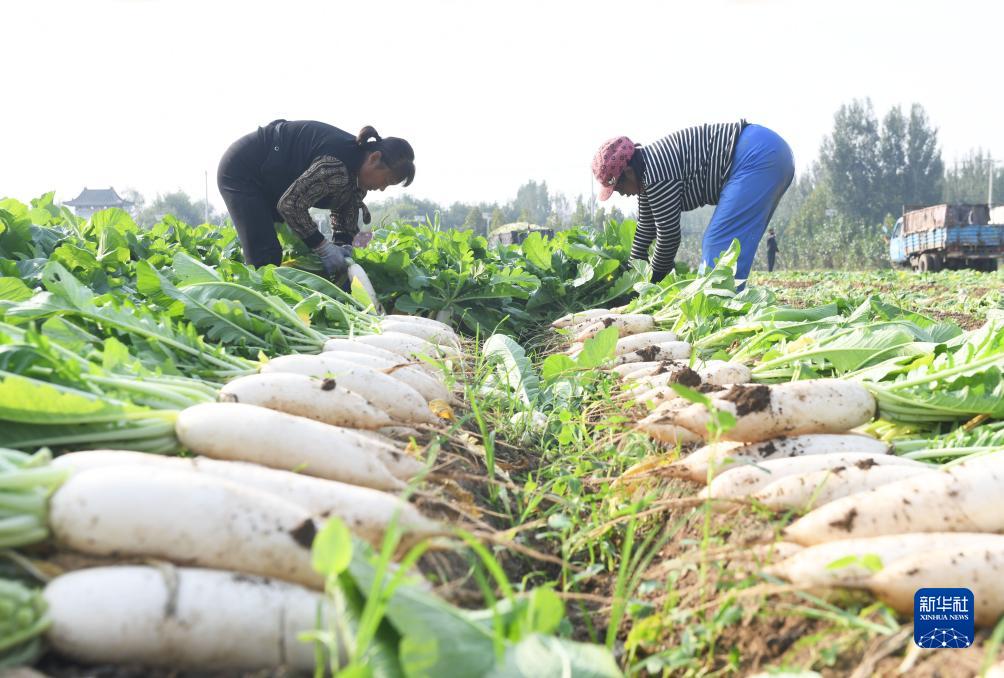 10月11日,河北省石家莊新樂市堅固村農民在收穫白蘿蔔。