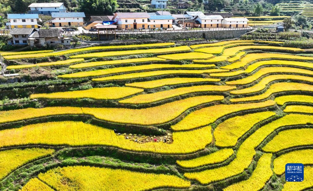 10月11日,湖北省宜昌市秭歸縣沙鎮溪鎮長春村村民在田間收穫高山冷水稻(無人機照片)。