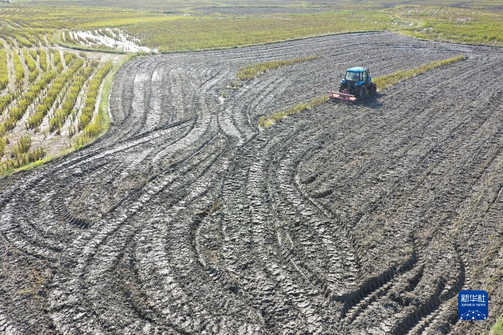 10月11日,在湖南省湘西土家族苗族自治州龍山縣石羔街道泗坪村,農機手駕駛拖拉機在耕田,準備種植油菜(無人機照片)。