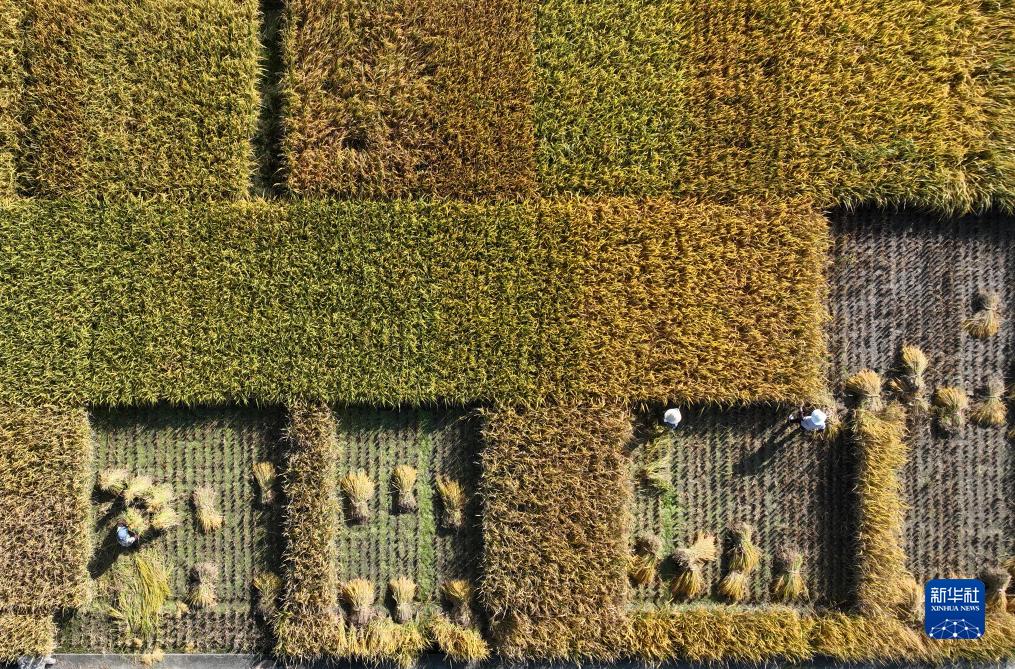 10月11日,農民在江蘇揚州市農科院的試驗田裏勞作(無人機照片)。