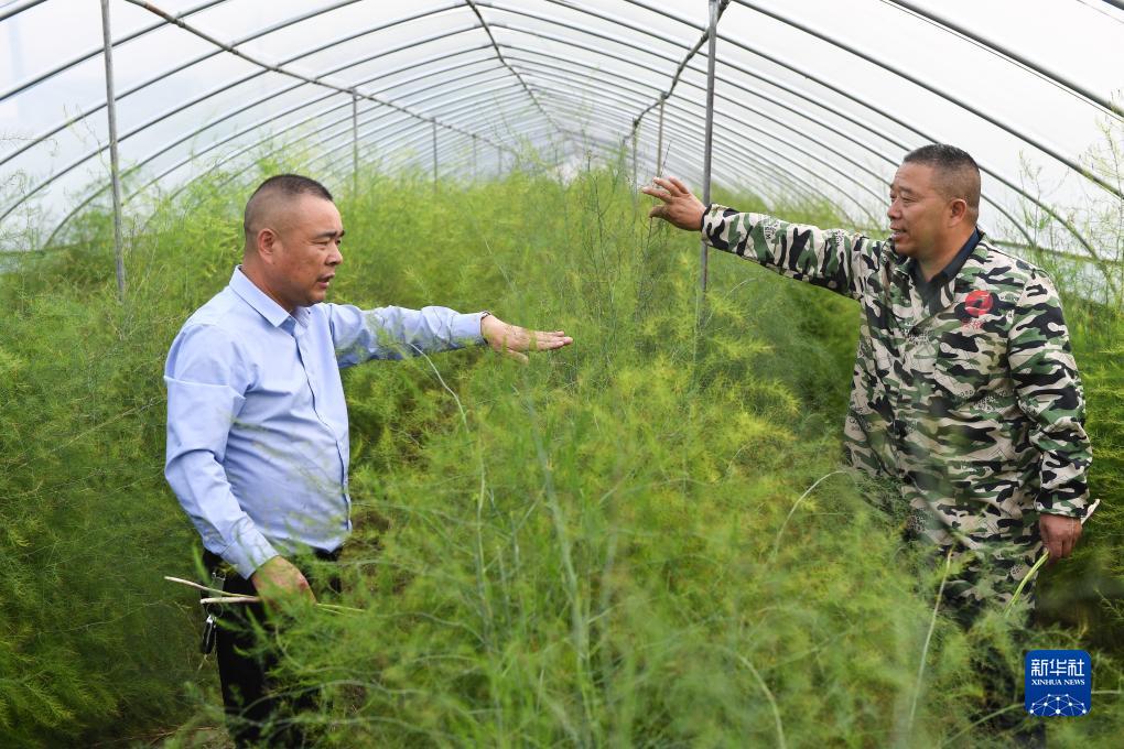 10月11日,在漣水縣紅窯鎮金城村,淮安市人大代表鄭標(左)給蘆筍種植戶傳授管護知識。鄭標是當地蘆筍種植大戶,帶領許多村民走上種植蘆筍之路。