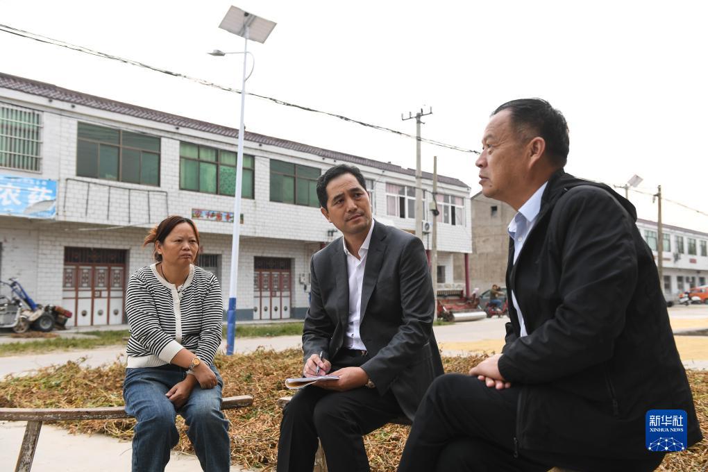 10月11日,在漣水縣紅窯鎮金沙村,漣水縣人大代表章金純(中)聽取黨員群眾關於村級發展的意見建議。在章金純的幫助下,該村實施了亮化綠化工程,群眾幸福感得到提升。
