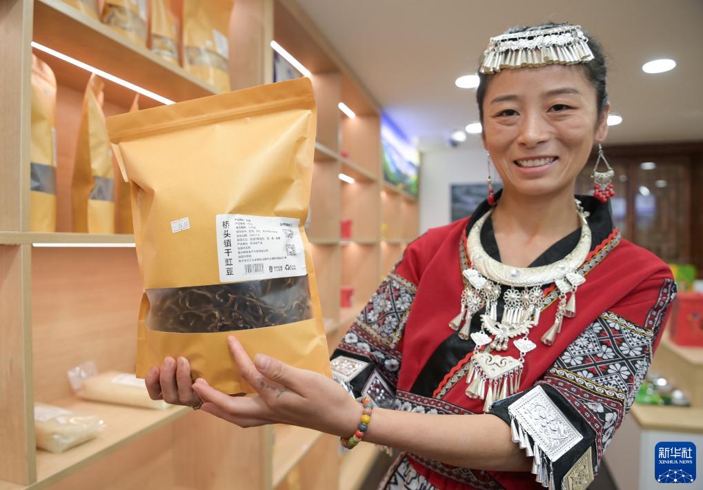 10月10日,在位於橋頭鎮的陶然居瓦屋小寨內的鄉村振興體驗館內,一名工作人員介紹當地土特産。
