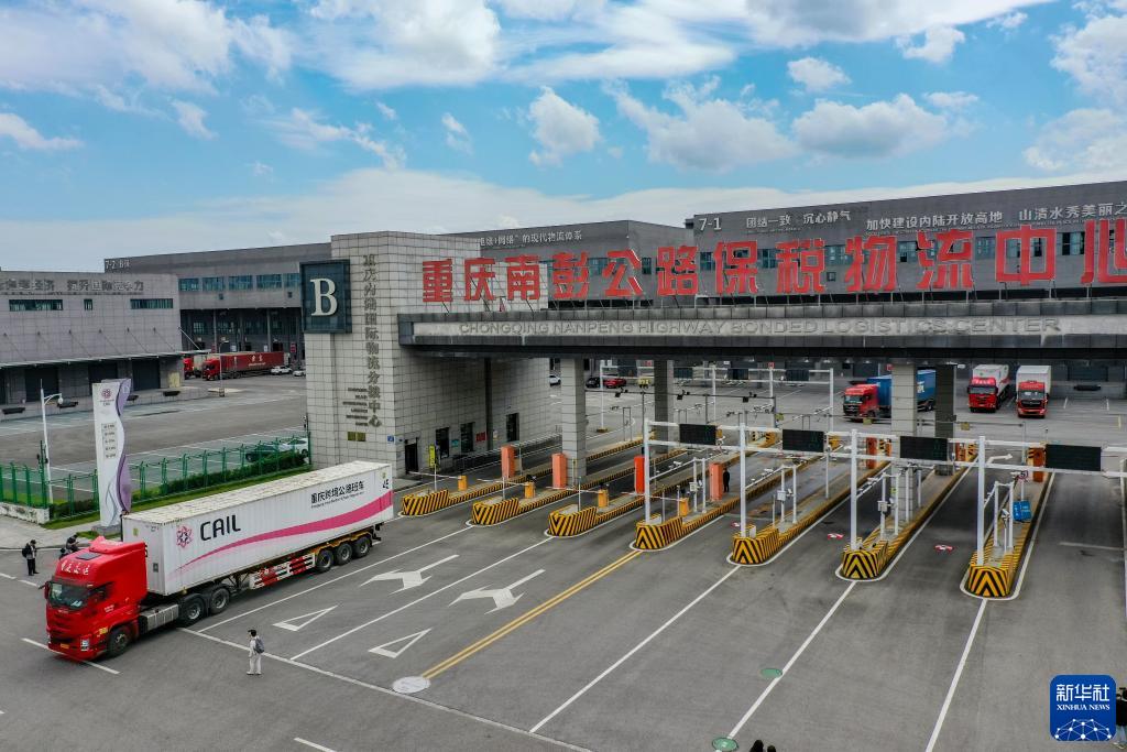 10月11日,滿載筆記本電腦配件、發電機組件等産品的西部陸海新通道跨境公路班車從重慶南彭公路保稅物流中心駛出,將途經廣西憑祥,直達越南(無人機照片)。