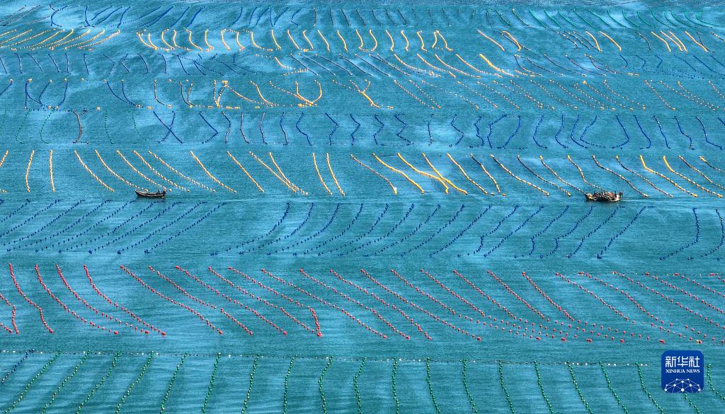 金秋時節,在山東省榮成市,各大海洋牧場海上養殖區一派繁忙景象,漁民駕駛漁船、舢板出海作業,在碧海上“繪”出一幅幅秋日漁耕圖。