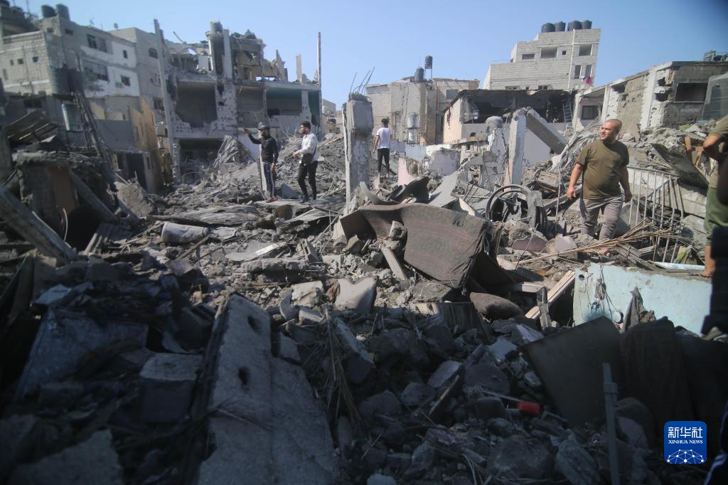 10月11日,在加沙地帶南部城市拉法,人們查看以色列空襲炸毀的建築。