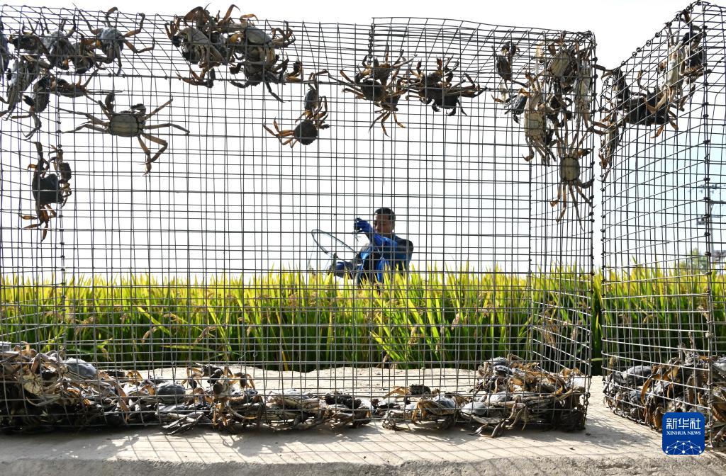 10月11日,河北省唐山市曹妃甸區第四農場的農民在鹽鹼地改良而成的稻漁綜合種養田間收穫稻田蟹。