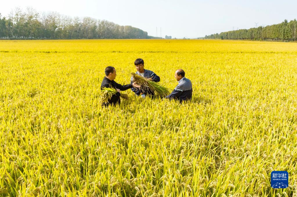 10月11日,在河北省唐山市曹妃甸區第五農場鹽鹼地改良而成的高標準稻田,農業科研人員採集測産稻樣(無人機照片)。