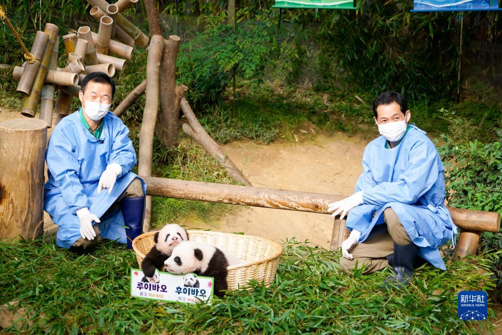 當日,旅韓大熊貓“愛寶”、“樂寶”的雙胞胎幼崽首次與公眾見面。雙胞胎幼崽的名字“睿寶”、“輝寶”也同時公布。