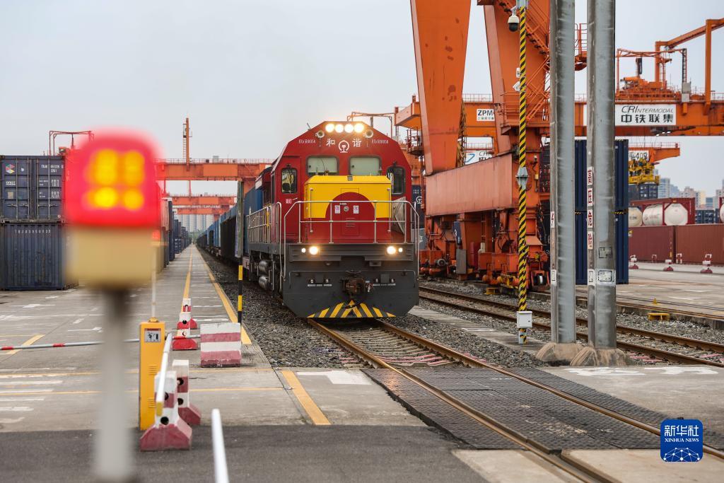 10月11日,一列滿載重質純鹼、汽油機等貨物的西部陸海新通道班列,從位於重慶國際物流樞紐園區的重慶團結村中心站駛出。