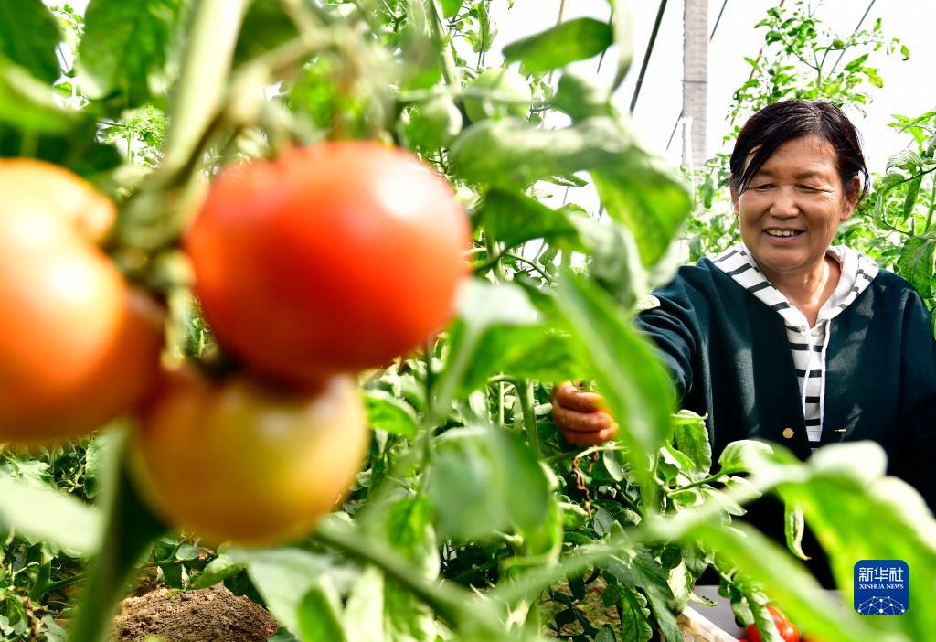 10月11日,村民在山東省惠民縣奧豐瓜菜種植專業合作社蔬菜大棚採摘西紅柿。