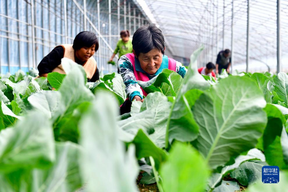 10月11日,村民在山東省惠民縣奧豐瓜菜種植專業合作社蔬菜大棚管護蔬菜。
