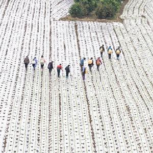 10月11日,在蓬安縣錦屏鎮中壩社區蔬菜種植基地,村民在田地裏進行蘿蔔幼苗“破膜露苗”作業(無人機照片)。