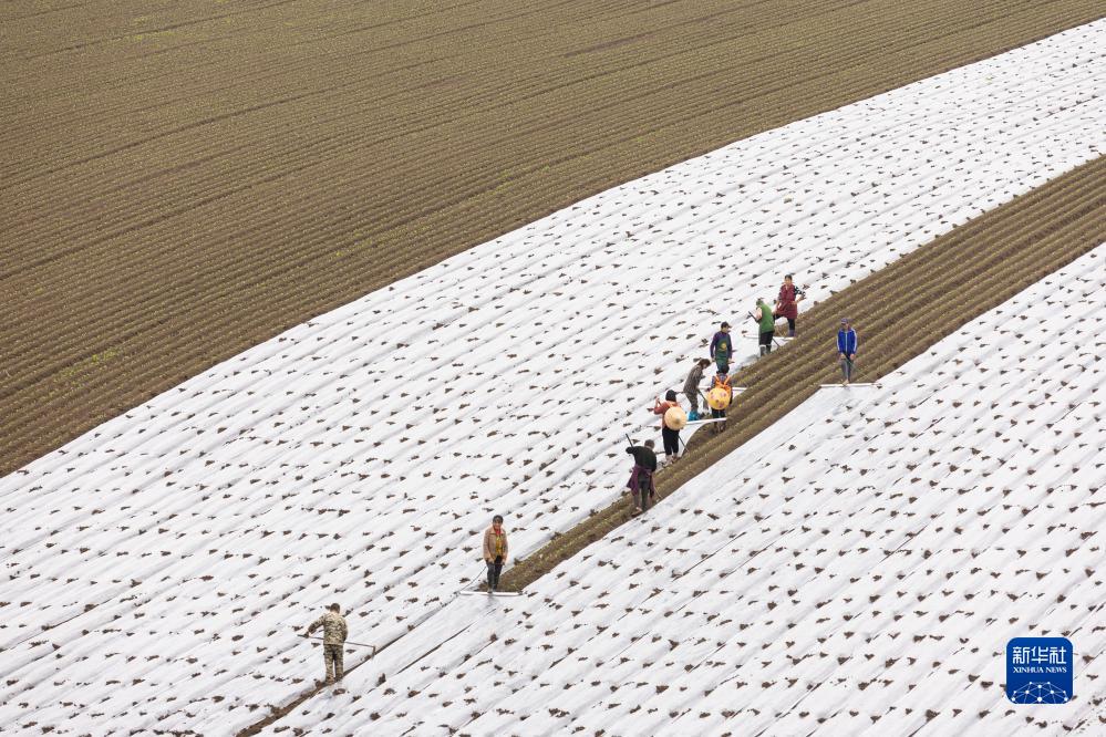 10月11日,在蓬安縣錦屏鎮中壩社區蔬菜種植基地,村民在田地裏覆地膜。