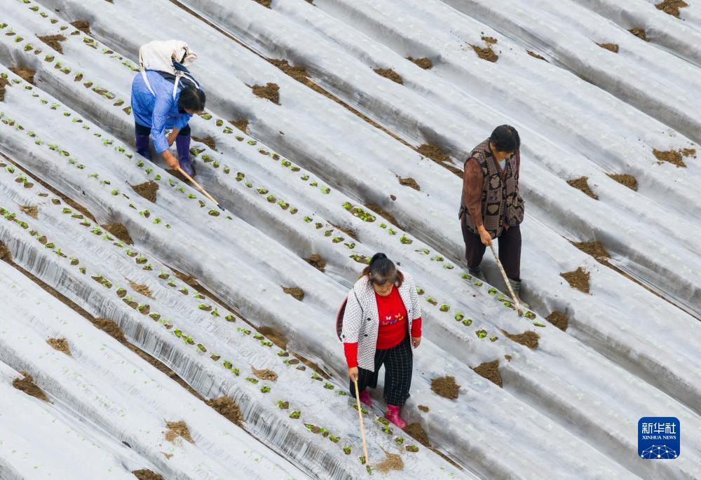 10月11日,在蓬安縣錦屏鎮中壩社區蔬菜種植基地,村民在田地裏進行蘿蔔幼苗“破膜露苗”作業(無人機照片)。