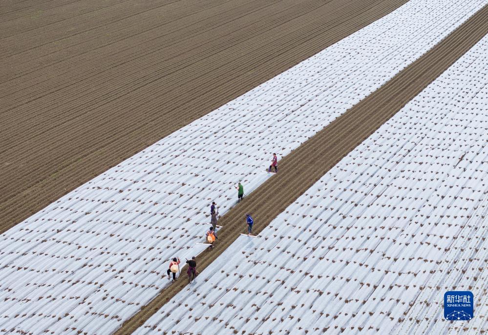 10月11日,在蓬安縣錦屏鎮中壩社區蔬菜種植基地,村民在田地裏覆地膜(無人機照片)。
