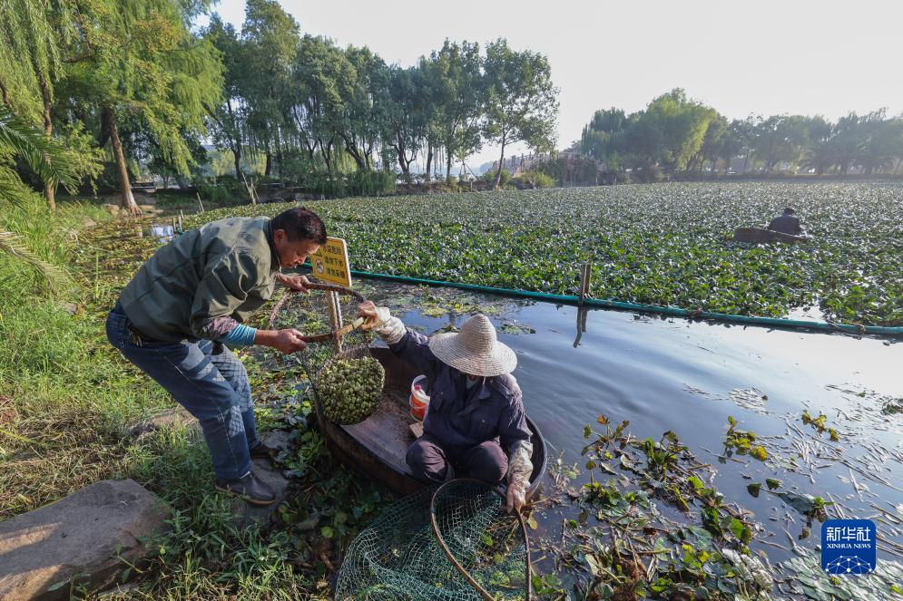 10月12日清晨,種植戶把剛採摘的新鮮南湖菱拿上岸,準備送去銷售點。