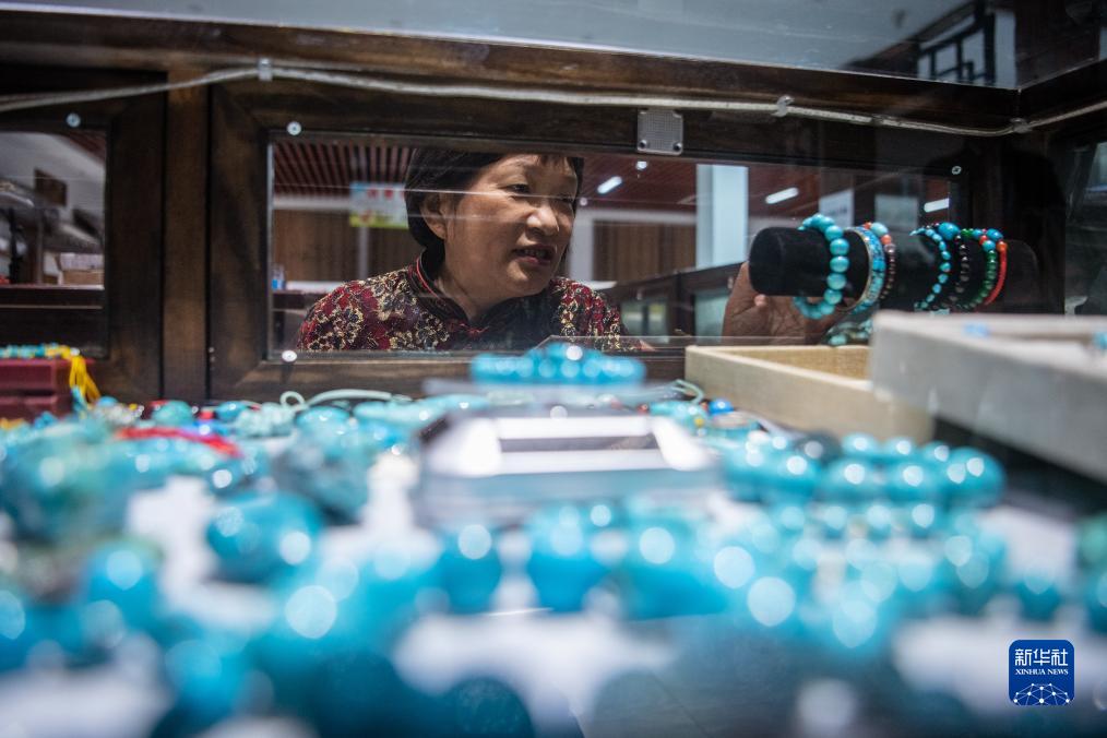 10月11日,湖北省鄖西縣下營村村民郭明鳳在介紹自己展銷櫃&內的綠松石製品。