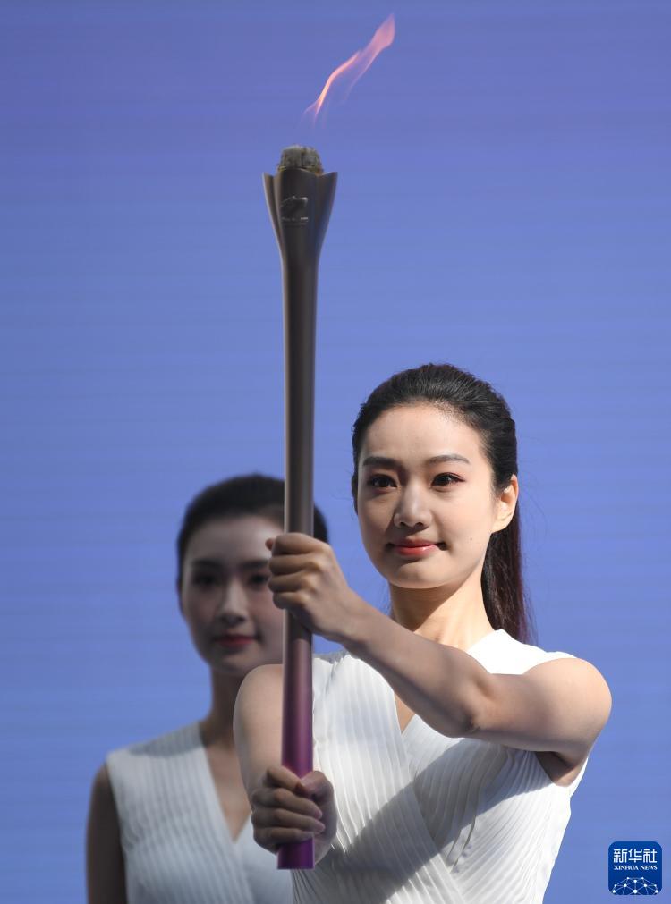 10月12日,採火使者在採集儀式上展示引燃的採火棒。