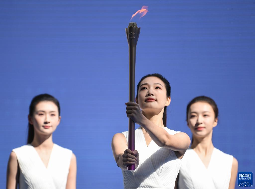 10月12日,採火使者在採集儀式上展示引燃的採火棒。