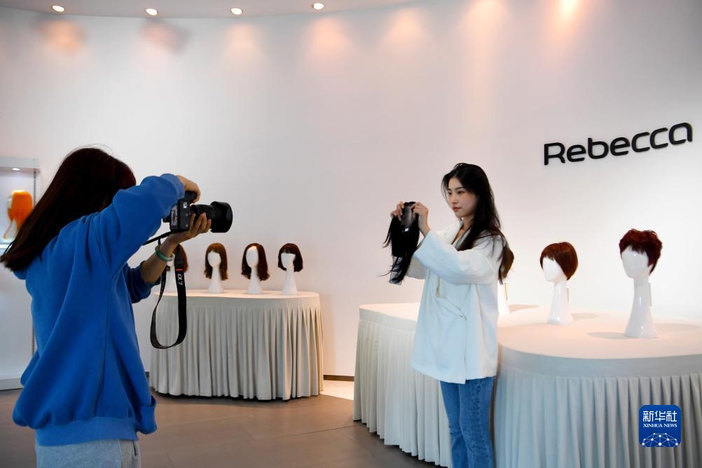 10月11日,工作人員在河南瑞貝卡發製品股份有限公司的展廳內拍攝産品。