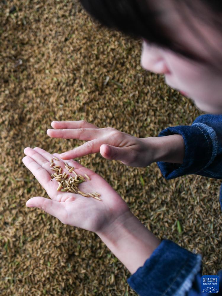 10月10日,在成都崇州市隆興鎮,王伶俐在查看今年新收穫水稻的品質。