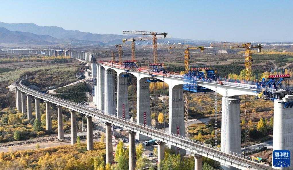 10月12日拍攝的集通鐵路電氣化改造工程多倫河特大橋剛構連續梁(無人機照片)。