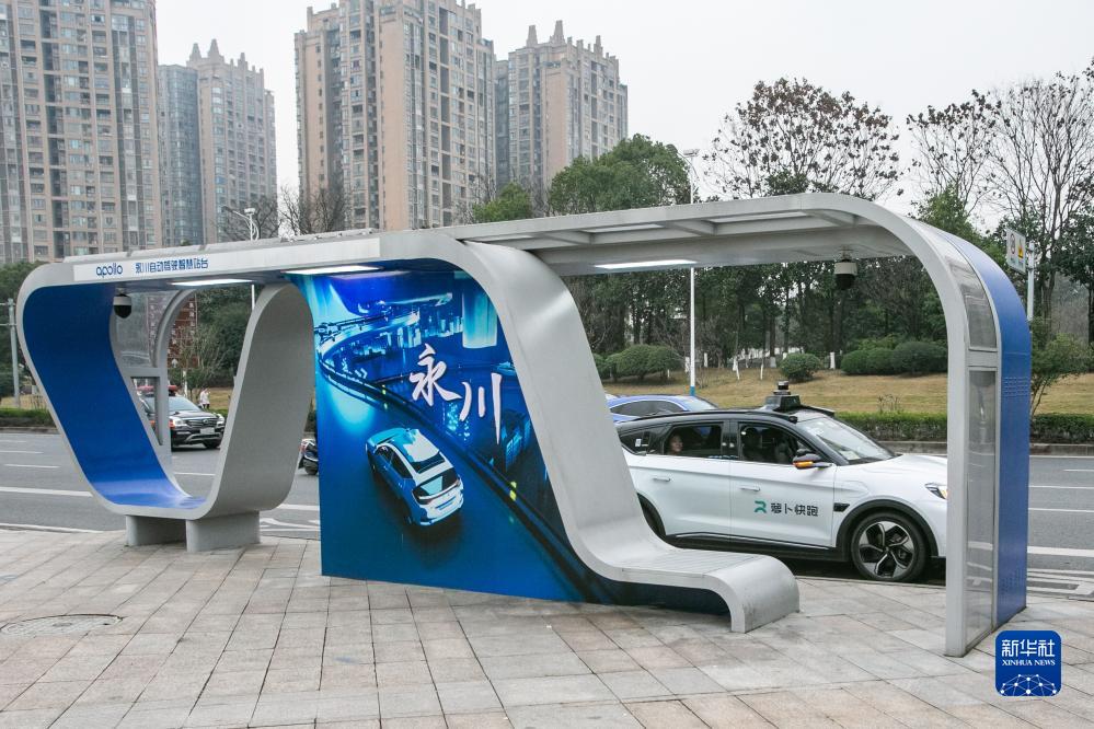 在重慶市永川區,乘客乘坐百度Apollo自動駕駛出行服務車離開自動駕駛智慧站&(3月1日攝)。