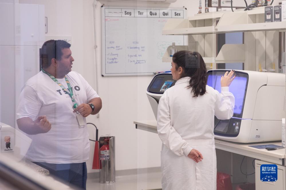 10月11日,在位於巴西聖保羅州克拉維紐斯的隆平巴西分子生物實驗室,工作人員(右)為訪客介紹育種器械。