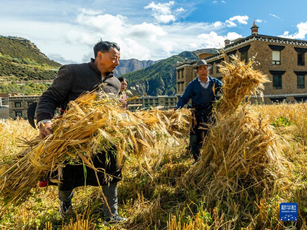 10月12日,在四川甘孜藏族自治州稻城縣亞丁村,村民將收割、捆紮好的青稞壘在一起。