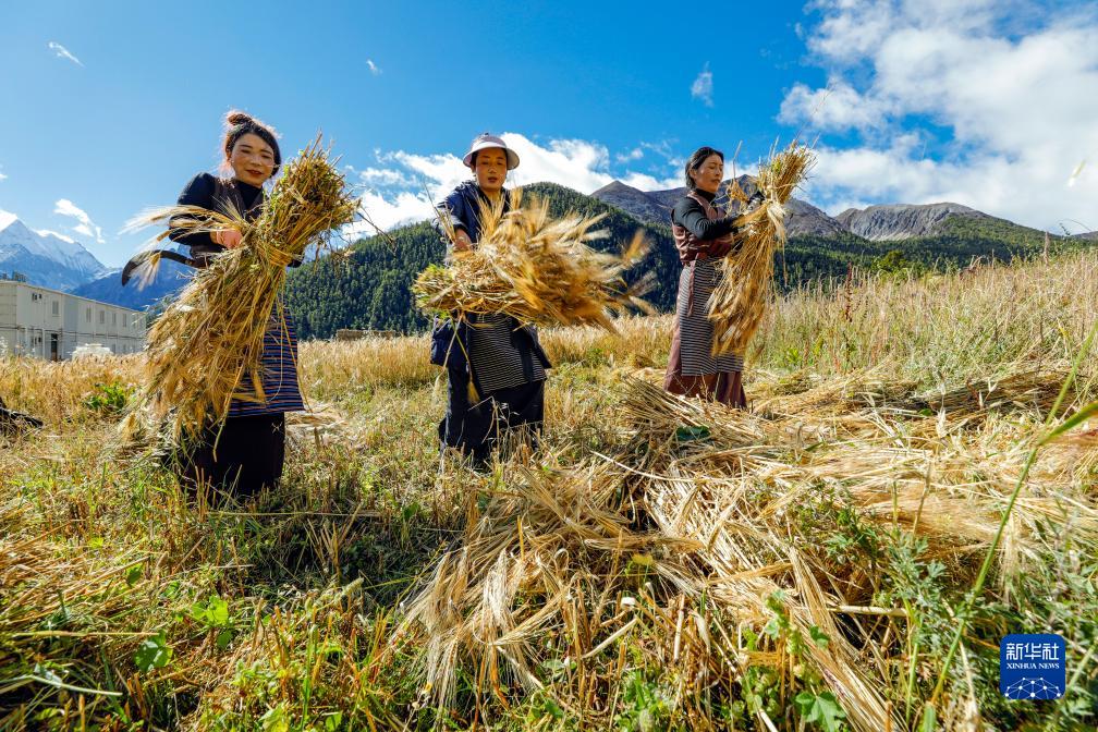 10月12日,在四川甘孜藏族自治州稻城縣亞丁村,村民澤仁拉姆、小松呷、格拉姆(從左至右)在捆紮她們收割的青稞。