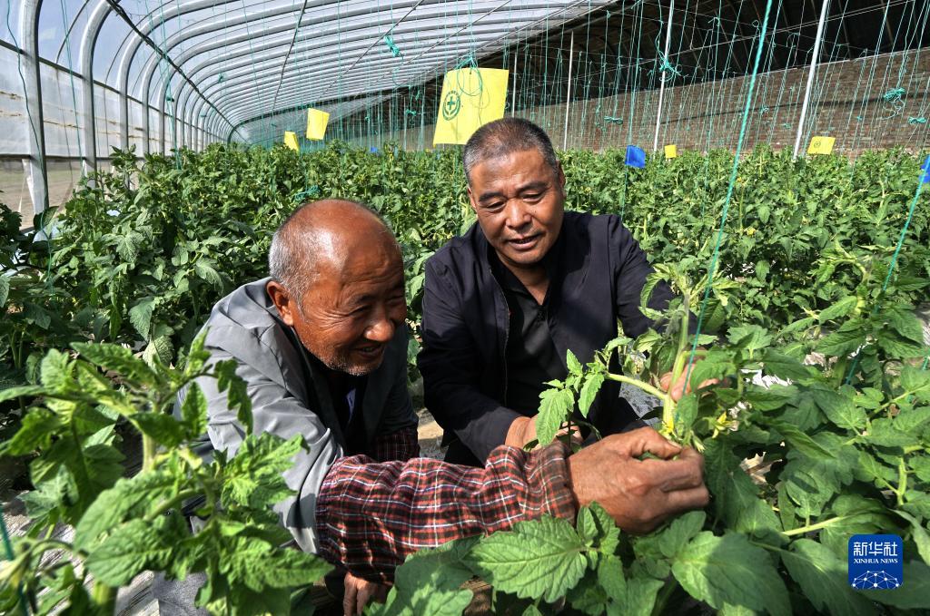 10月10日,大興區長子營鎮潞城營一村黨支部書記連書山(右)和管護大棚的農民在觀察大棚蔬菜長勢。