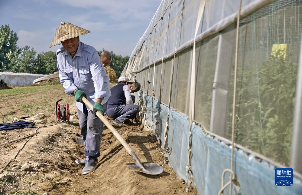 10月10日,大興區長子營鎮潞城營一村的農民在進行秋季大棚加固維修工作。