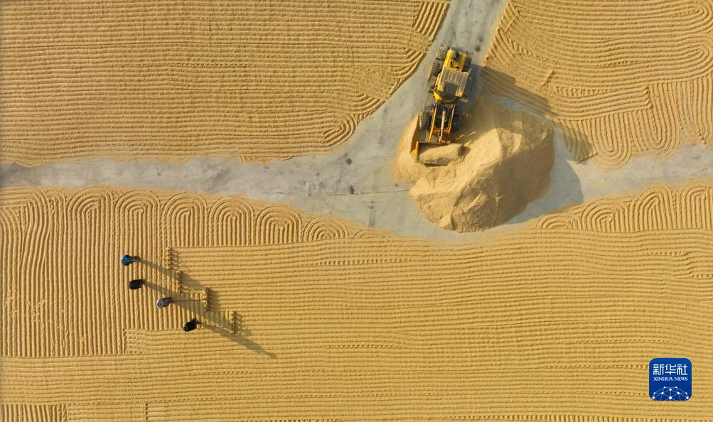 10月12日,在燈塔市禾谷茂源水稻種植專業合作社,農民在晾曬收穫的水稻(無人機照片)。